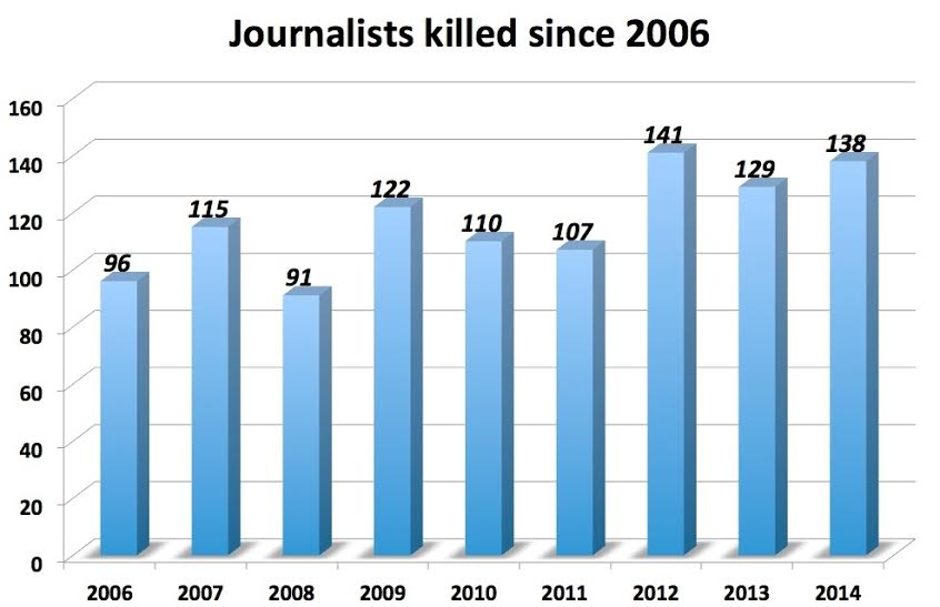 كشف التقرير السنوي لحملة الشارة الدولية لحماية الصحفيين  الصادر في العام المنصرم 2014 بجنيف، عن ارتفاع عدد الصحفيين المقتولين في 15 ديسمبر الماضي من 128 صحفياً وصحفيه قتلوا في 32 دولة إلى 138 في نهاية  2014 بزيادة عشرة صحفيين قتلي .