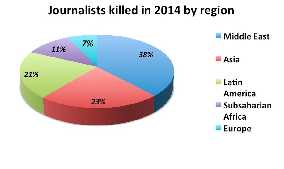 وتصدرت منطقة الشرق الأوسط المناطق الخطرة للعمل الصحفي بمقتل 52 من الصحفيين تليها آسيا 32 ثم أمريكا اللاتينية 29 ثم إفريقيا جنوب الصحراء 15 وأوروبا 10صحفيين .