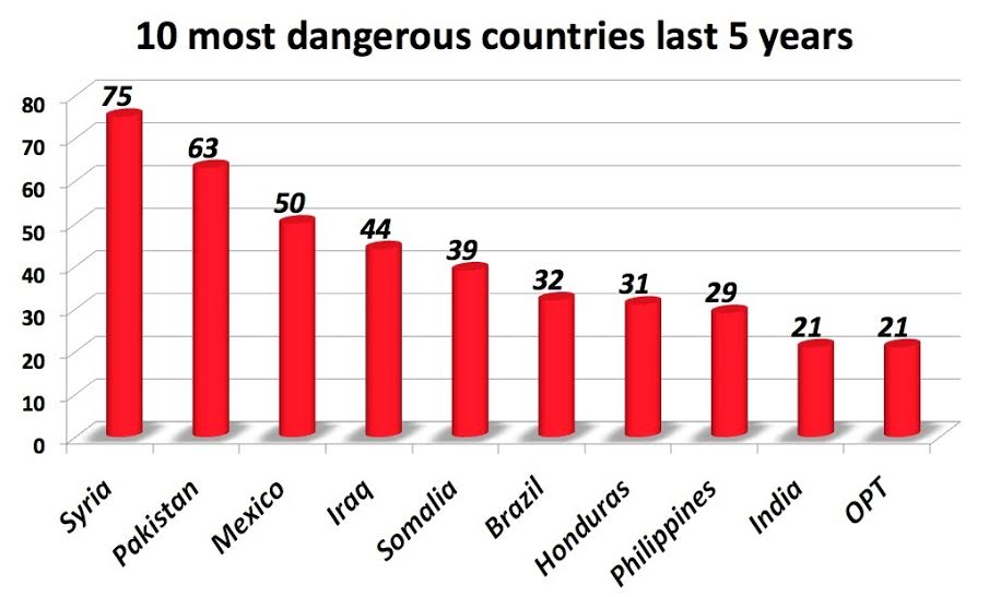 وكانت أكثر الدول خطورة في السنوات الخمس الماضية هي سوريا بمقتل 75 من الصحفيين، ثم باكستان 63، ثم المكسيك 50 ثم العراق 44 فالصومال 39 ، فالبرازيل 32، ثم هندوراس 31، فالفلبين 29، ثم الهند 21،  فالأراضي الفلسطينية المحتلة 21.