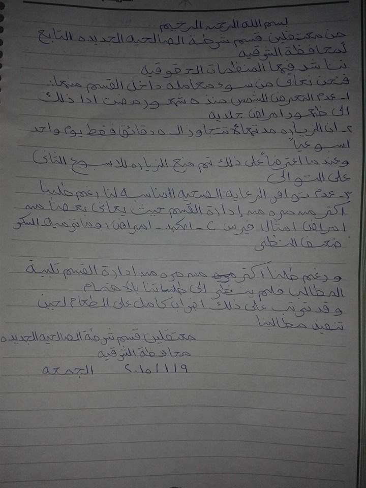 وطالب المعتقلون في رسالتهم توفير الرعاية الصحية لهم، وأضافوا: "نعاني من عدم توفير الرعاية الصحية لنا، رغم طلبنا أكثر من مرة من إدارة القسم، حيث يعاني بعضنا من أمراض مثل فيروس سي والكبد وأمراض روماتيزمية والسكر، وضعف النظر".