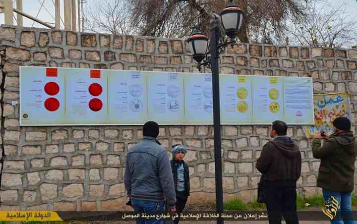 علّقت الدولة الإسلامية لوحات إعلانية في مدينة الموصل تهدف إلى توضيح مزايا وقيمة العملة الجديدة التي ستبدأ بالانتشار في مناطق سيطرة التنظيم قريبًا.