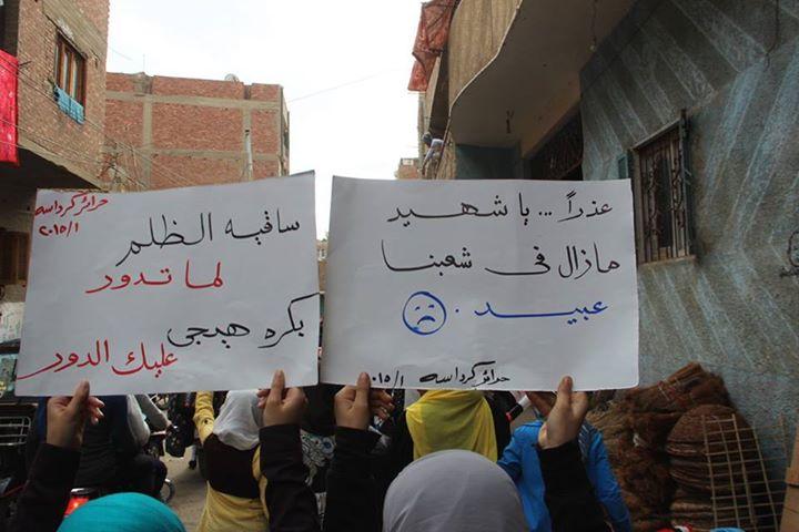 رفع المشاركون شارات رابعه العدوية وصور الرئيس محمد مرسي، وأكدوا استمرار فعالياهم المناهضة لحكم العسكر حتى اسقاطة، رافعين صور عدد من شهداء كرداسة مطالبين بالقصاص لهم