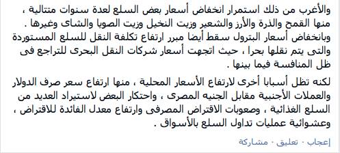 لكنه رجح في الوقت نفسه أن هناك أسبابا أخرى لارتفاع الأسعار المحلية، منها ارتفاع سعر صرف الدولار والعملات الأجنبية مقابل الجنيه المصري، واحتكار البعض لاستيراد العديد من السلع الغذائية، وصعوبات الاقتراض المصرفي وارتفاع معدل الفائدة للاقتراض، وعشوائية عمليات تداول السلع بالأسواق.