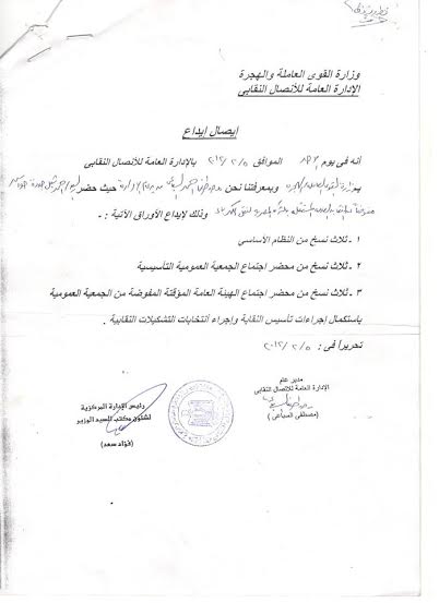 وأكدت "النقابة" في بيان لها اليوم تلقت "رصد" نسخة منه، أنها أودعت أوراقها بديوان عام وزارة القوى العاملة برقم 175/ 2 بتاريخ 5/ 2/ 2012.