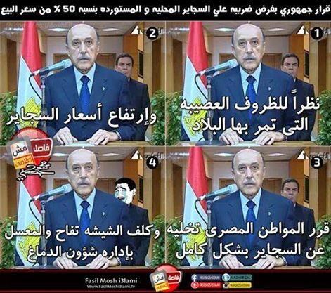 فرض قائد الانقلاب عبد الفتاح السيسي، ضرائب جديدة على السجائر، القرار الذي أثار موجات من السخرية على مواقع التواصل الاجتماعي  والغضب خاصة أن حكومة الانقلاب رفعت أسعارها العام الماضي.