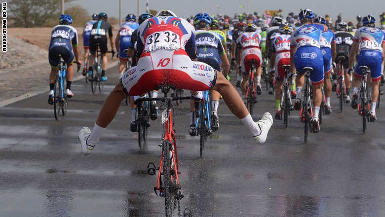 9 – راكب الدراجات الهوائية الإيطالي، جاكوبو غوارنيني يقفز في بركة مياه خلال المرحلة السادسة من دوري عمان للداراجات الهوائية في 22 فبراير.