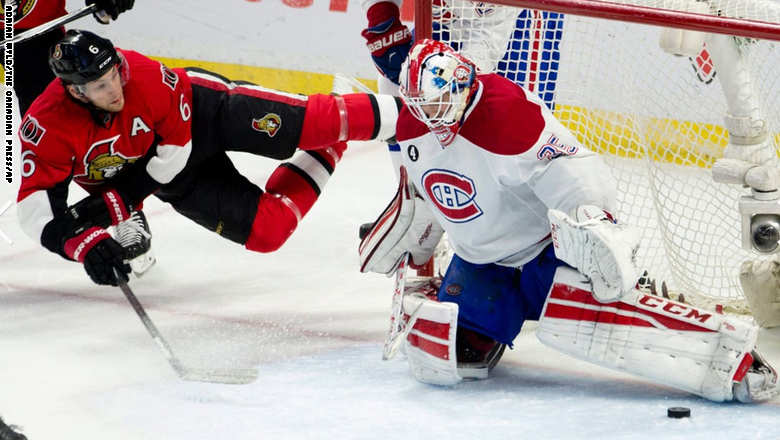 10 – حارس مرمى فريق مونتريال كانيديانز، داستن توكراسكي، يلتقط ضربة من خصمه بوبي رايان من فريق أوتوا، خلال دورة ألعاب الهوكي الوطنية المقامة في أوتوا بتاريخ 18 فبراير.
