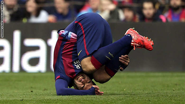 2 – لاعب فريق برشلونة لكرة القدم، لويس سواريز، يسقط أرضاً في مباراة بالدوري الإسباني ضد فريق مالاغا ببرشلونة، الذي غلب الفريق المستضيف بهدف مقابل لا شيء.