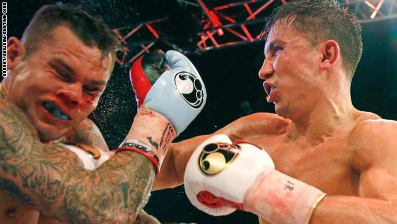 3 – بطل الملاكمة من فئة الوزن المتوسط، غينادي غولوفكين (اليمين) يوجه لكمة لخصمه مارتن موراي في مباراة للفوز باللقب التي أقيمت في مونتي كارلو بموناكو يوم السبت، 22 فبراير وفاز غولوفكين في الجولة 11 ليستعيد اللقب وتاريخه الخالي من الهزائم.