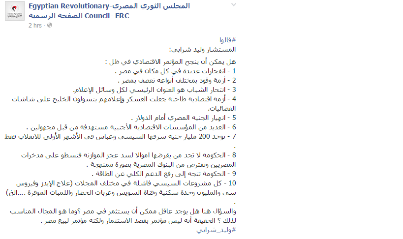 ووفقًا لما نشرته صفحة المجلس الثوري المصري على موقع التواصل الاجتماعي "فيس بوك"، تساءل "شرابي" عن إمكانية نجاح المؤتمر، في ظل أجواء وصفها بالمضطربة، مفصلًا: "أجواء تملؤها الانفجارات بالإضافة إلى أزمة الوقود التي تعصف بمصر، وانتحار الشباب اليائس".