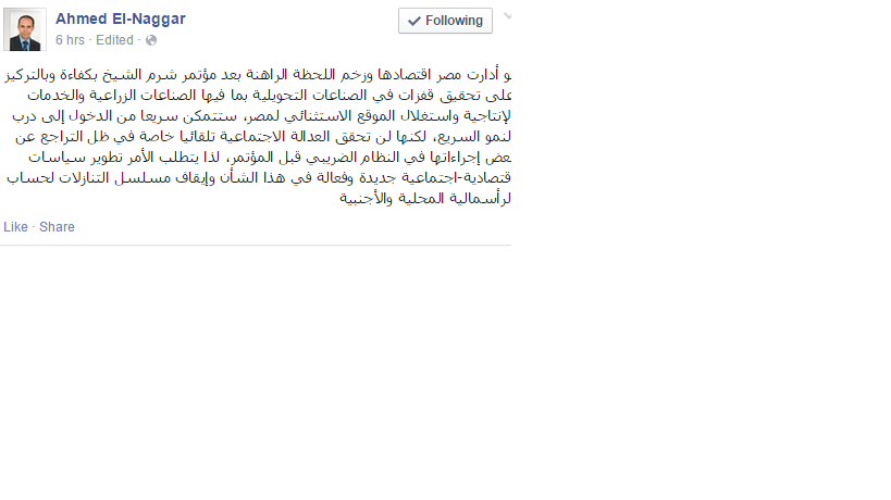 وقال الخبير الاقتصادي ورئيس مجلس إدارة الأهرام، أحمد النجار، عبر صفحته الشخصية على موقع التواصل الاجتماعي "فيس بوك"، إن مصر لن تحقق العدالة الاجتماعية تلقائيا، في ظل التراجع عن بعض إجراءاتها في النظام الضريبي قبل المؤتمر، مبينا أن الأمر يتطلب تطوير سياسات اقتصادية اجتماعية جديدة وفعالة في هذا الشأن، وإيقاف مسلسل التنازلات لحساب الرأسمالية المحلية والأجنبية.