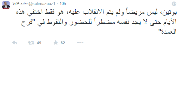 وأوضح الكاتب الصحفى سليم عزوز أن "بوتين ليس مريضا، ولم يتم الانقلاب عليه، هو فقط اختفى هذه الأيام حتى لا يجد نفسه مضطرا للحضور والنقوط في فرح العمدة".