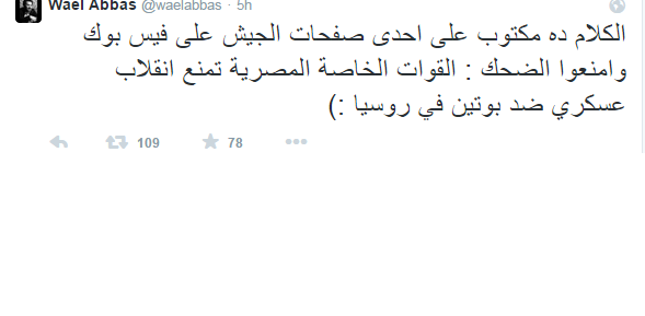 وقال الناشط وائل عباس إن "ظهور بوتين جاء بعد قيام القوات الخاصة المصرية بمنع انقلاب عسكري ضد بوتين في روسيا، الكلام ده مكتوب على إحدى صفحات الجيش على فيس بوك، وامنعوا الضحك".