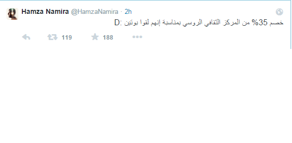 وقال الفنان حمزة نمرة ساخرا إن "خصم 35% من المركز الثقافي الروسي بمناسبة إنهم لقوا بوتين".