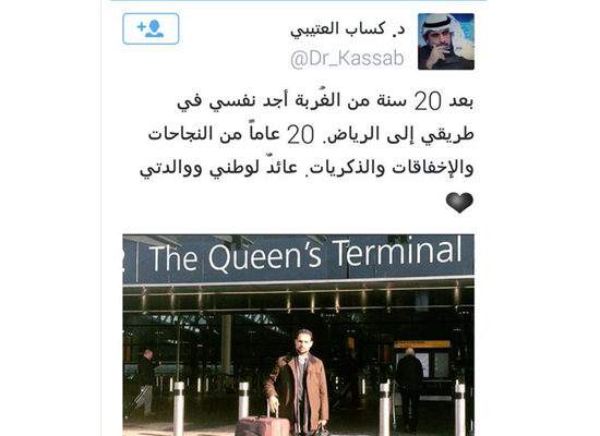 أعلن المعارض السعودي، الدكتور كساب العتيبي، عن عودته إلى السعودية بعد 20 عاما قضاها في الخارج.