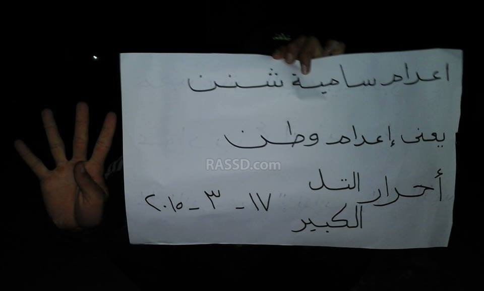حمل المشاركون لافتات كتب عليها: "إعدام سامية شنن= إعدام وطن"، "الحرية للجدعان".