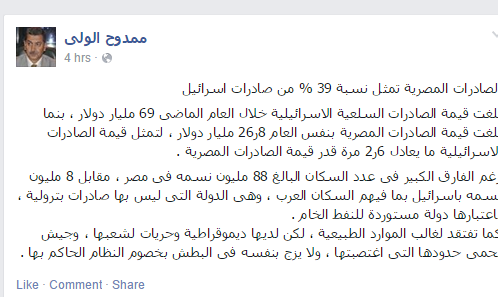 وأشار ممدوح الولي إلى أن نجاح الاحتلال الإسرائيلي في ذلك، يأتي بسبب "الديموقراطية والحرياتوالجيش الذي ولا يزج بنفسه فى البطش بخصوم النظام الحاكم بها، رغم فقدها للموارد الطبيعيه"، حسب قوله.