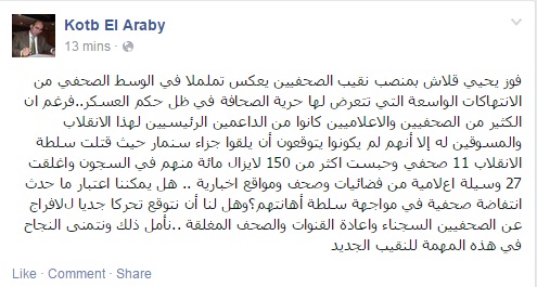 وكتب في تدوينة له عبر صفحته على موقع التواصل الاجتماعي"فيس بوك": " فرغم أن الكثير من الصحفيين واﻻعلاميين كانوا من الداعمين الرئيسيين لهذا اﻻنقلاب والمسوقين له إﻻ أنهم لم يكونوا يتوقعون أن يلقوا جزاء سنمار حيث قتلت سلطة اﻻنقلاب 11 صحفي وحبست اكثر من 150 ﻻيزال مائة منهم في السجون واغلقت 27 وسيلة اعﻻمية من فضائيات وصحف ومواقع إخبارية".