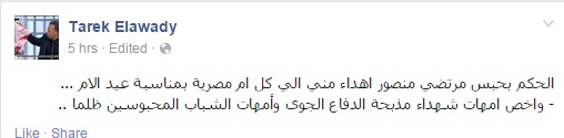 وأضاف قائلا: "الحكم بحبس مرتضى منصور إهداء مني إلى كل أم مصرية بمناسبة عيد الأم، وأخص أمهات شهداء مذبحة الدفاع الجوى وأمهات الشباب المحبوسين ظلما".