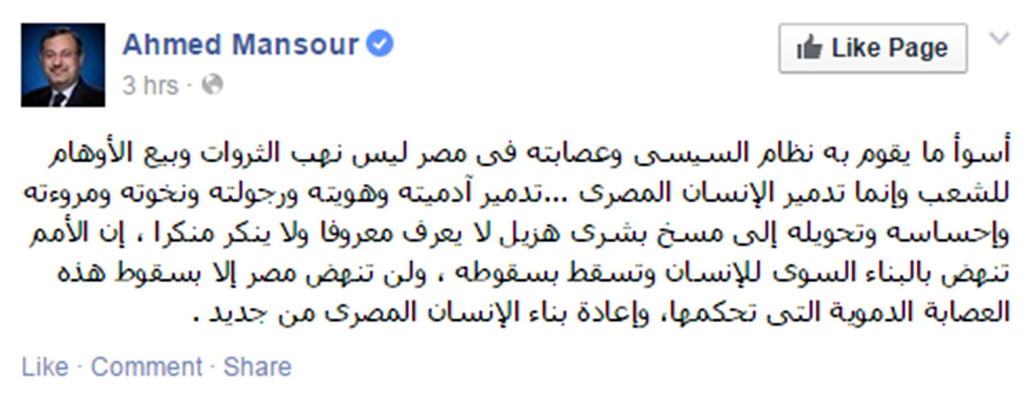وأشار منصور إلى أن الأمم تنهض بالبناء السوي للإنسان وتسقط بسقوطه، مؤكدا أن "مصر لن تنهض إلا بسقوط هذه العصابة الدموية التي تحكمها، وإعادة بناء الإنسان المصري من جديد".