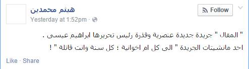 من ذلك، تعليق الناشط السياسي، هيثم محمدين، الذي وصف صحيفة المقال بالعنصرية. وقال "محمدين"، إنها، صحيفة "عنصرية وقذرة"