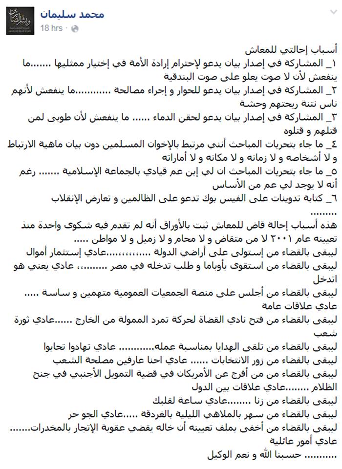 وأجمل في تدوينة على موقع التواصل الاجتماعي فيس بوك أسباب إحالته للمعاش في عدة نقاط ذكرها، معلقًا على كل منها، كالتالي: