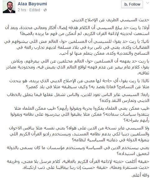 وأضاف- في تدوينة له على موقع التواصل الاجتماعي: "يا ريت حد يقول للسيسي أن المسلمين حول العالم مش اللي بيشوفهم في الفضائيات وكده، يعني في ناس بره في بلاد مسلمة لديهم تجارب رائعة في التسامح والتعددية وكده، ممكن يتعلم منها لو أحب".