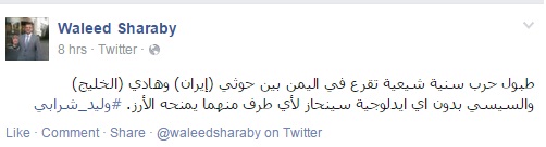 وكتب، في تدوينة له عبر صفحته الشخصية على موقع "فيس بوك": "طبول حرب سنية شيعية تقرع في اليمن بين حوثي (إيران) وهادي (الخليج)، والسيسي دون أي أيديولوجية سينحاز لأي طرف منهما يمنحه الأرز".