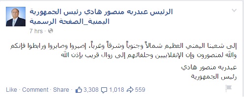 وكتب في تدوينة له عبر صفحته الرسمية على "فيس بوك": إلى شعبنا اليمني العظيم شمالاً وجنوباً وشرقاً وغرباً، اصبروا وصابروا ورابطوا فإنكم والله لمنصورون، وإن الإنقلابيين وحلفاءهم إلى زوال قريب بإذن الله.. عبدربه منصور هادي.. رئيس الجمهورية".