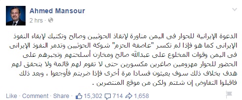 وكتب في تدوينة له عبر صفحته الرسمية على موقع "فيس بوك": "إذا لم تكسر "عاصفة الحزم" شوكة الحوثيين وتدمر النفوذ الإيرانى فى اليمن وقوات المخلوع على عبدالله صالح ومخازن أسلحتهم، وتجبرهم على الحضور للحوار مهزومين صاغرين مكسورين حتى لا تقوم لهم قائمة ولا يتحقق لهم هدف، بخلاف ذلك سوف يعيثون فسادا مرة أخرى، فإذا ضربتم فأوجعوا، وبعد ذلك فاقبلوا التفاوض إن شئتم، ولكن من موقع المنتصرين".