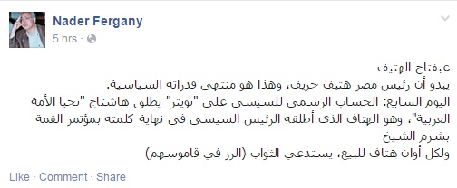 وقال فرجاني: "يبدو أن رئيس مصر هتيف حريف، وهذا هو منتهى قدراته السياسية.. "اليوم السابع": الحساب الرسمي للسيسي على "تويتر" يطلق هاشتاج تحيا الأمة العربية"، وهو الهتاف الذي أطلقه الرئيس السيسي في نهاية كلمته بمؤتمر القمة بشرم الشيخ".