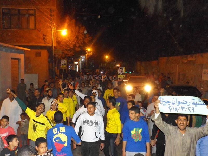 خرج رافضو حكم العسكر في منشية رضوان شمالي الجيزة، في مسيرة ليلية انطلقت من أمام مسجد دعوة الحق، نددوا فيها بالحملات الأمنية التي تشنها داخلية الانقلاب بحق المعارضين، في ما لاقت تعاطف الأهالي وتفاعلهم، حيث لوحوا بشارات رابعة للمشاركين.