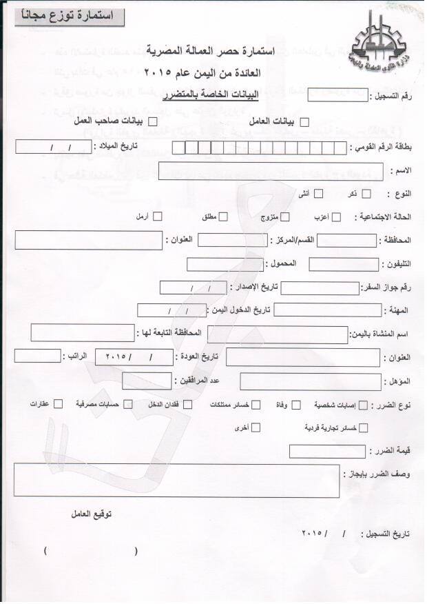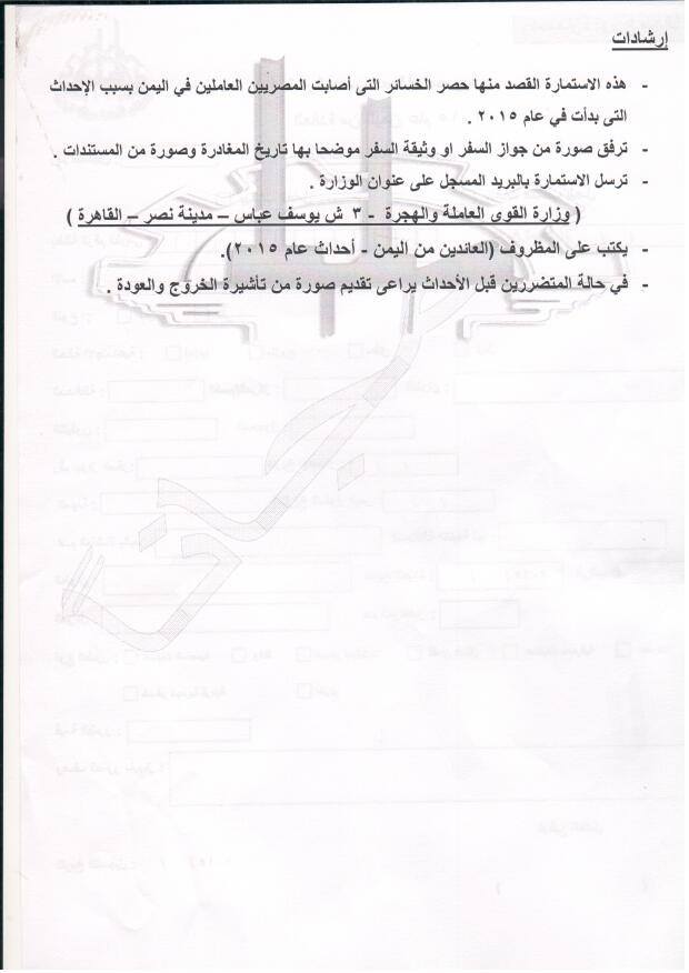 وطالبت الوزارة المتضرر بأن يرفق مع الاستمارة صورة من جواز أو وثيقة السفر، موضحا بها تاريخ المغادرة وصورة من المستندات الدالة على خسائره، وترسل جميعها بالبريد المسجل على عنوان وزارة القوى العاملة والهجرة (3 شارع يوسف عباس – مدينة نصر- القاهرة )، ويكتب على المظروف من الخارج "العائدون من اليمن عام 2015"، وفي حالة المتضررين قبل الأحداث يراعي تقديم صورة من تأشيرة الخروج والعودة.