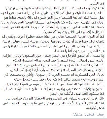 وأبرز أن دول الخليج العربي "قد تكون أكثر مناطق العالم ازدهارًا ماليًا ظاهريًا، ولكن تركيبتها الداخلية هشة للغاية، وتعمل في الأجل الطويل لصالح إيران، ففي بعض الدول تصل نسبة أبناء الطائفة الشيعية بين المواطنين إلى 40%، مثلما هو الحال في الكويت، ومن عشرة إلى 15 بالمئة بالسعودية، وأربعة أضعاف هذه النسبة في البحرين، وإذا اشتعلت الحرب الطائفية فإنه من الصعب أن يظل هؤلاء أو على الأقل بعضهم صامتين".