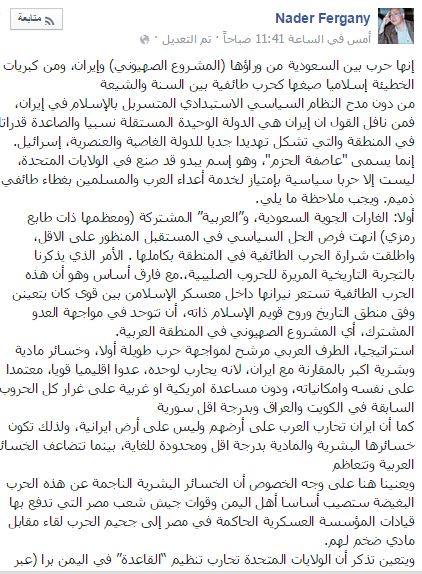 وقال نادر فرجاني، إن "إيران، العدو المستهدف من قبل التحالف العربي المستحدث بعقلية الارتزاق، حرصت طول الحروب التي خاضتها في المنطقة أن تظل في المقعد الخلفي، وإذا اشتركت فبقوات غير رسمية، ومن خلال حلفائها، مثل حزب الله وحماس والجهاد الإسلامي وأنصار الله الحوثيين اليزيديين من أهل اليمن".