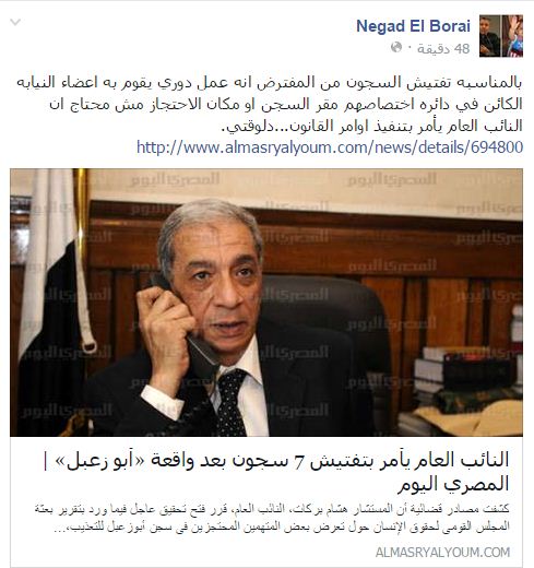 وقال، عبر تدوينة له على موقع التواصل الاجتماعي "فيس بوك": "بالمناسبة تفتيش السجون من المفترض أنه عمل دوري يقوم به أعضاء النيابة الكائن في دائرة اختصاصهم مقر السجن أو مكان الاحتجاز مش محتاج أن النائب العام يأمر بتنفيذ أوامر القانون".