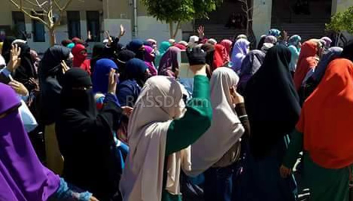 نظمت طالبات كلية الدراسات الإسلامية بالمنصورة، تظاهرة مفاجئة داخل المبنى الرئيسي بالكلية. هتفت الطالبات خلالها هتافات منددة بفصل زميلاتهن ومطالبة بعودتهن إلى الكلية.