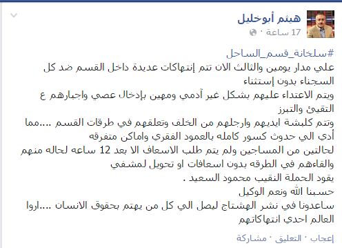 وفي تدوينة له على موقع التواصل الاجتماعي "فيس بوك"، أضاف "أبوخليل"، أنه "يتم الاعتداء على السجناء بشكل غير آدمي ومهين، بإدخال عصي وإجبارهم على التقيؤ والتبرز".