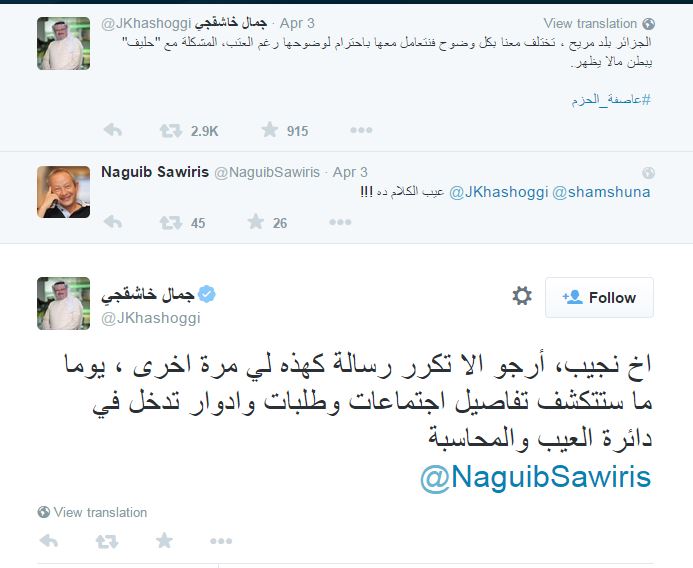 وقع اشتباك لفظي على العلن، بين الكاتب السعودي جمال خاشقجي، المقرّب من الملك سلمان بن عبد العزيز، ورجل الأعمال الانقلابي نجيب ساويرس.