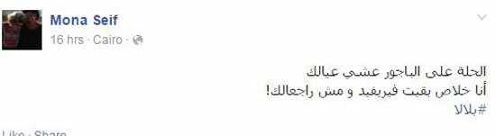 وأضافت “الحلة على الباجور عشي عيالك أنا خلاص بقيت فيريفيد ومش رجعالك”.