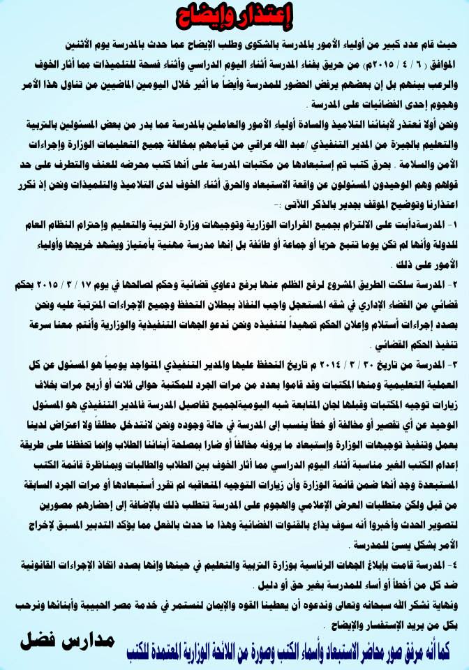 وقامت المدرسة، في صفحتها على «فيس بوك» بالاعتذار لأولياء أمور الطلاب، وقالت في بيان لها: «نعتذر للسادة أولياء الأمور والتلاميذ عما بدر من المسؤولين بمديرية التربية والتعليم، بمخالفة تعليمات الوزارة، وإحراق كتب التراث على اعتبار أنها كتب تحرض على العنف والكراهية والإرهاب».