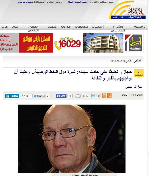 رغم التحالف العلني بين نظام الانقلاب ودول الخليج، وعلى رأسها السعودية، فإن الكاتب المقرب من السلطات المصرية أحمد عبد المعطي حجازي هاجم المملكة في أكبر جريدة حكومية، قائلًا: “أحداث سيناء ثمرة دول النفط الوهابية” في إشارة للمملكة.