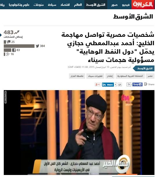 وأضافت سي إن إن “واصلت شخصيات مصرية معروفة هجومها على دول خليجية، وعلى المدرسة (الوهابية)، في ظاهرة تتكرر منذ فترة بوسائل الإعلام المصرية، رغم التحالف المعلن بين الرئيس عبد الفتاح السيسي ودول الخليج، وبرز في هذا الإطار تحميل الشاعر المعروف، أحمد عبد المعطي حجازي، لما وصفها بـ(دول النفط الوهابية) مسؤولية هجمات سيناء الأخيرة”.