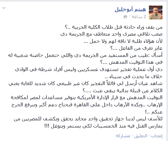 وقال “أبوخليل”- عبر تدوينة له على موقع التواصل الاجتماعي “فيس بوك”: “صعب تلاقي مصري واحد متعاطف مع الجريمة دي، لأن هؤلاء طلبة لا ناقة لهم ولا جمل“.