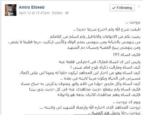وتضيف في تدوينة نشرتها عبر صفحتها الرسمية على موقع “فيس بوك”: “تزوجت لأقطع ألسنة الذين يرون في الأرملة عرضا مستباحا وصيدا سهلا يرمون عليه شباكهم ولن يفهم ذلك إلا من مر بتلك الظروف، فنحن نعانى فى مجتمع مريض يعج بالآفات القذرة التى أصابت حياتنا بالعفن.. تزوجت أبا لابنتى يحاول تعويضها عن فقد أبيها الشهيد وتعيش فى ظل أسرة فقدت معناها منذ ما يقرب من سنتين.. من لم يعش حياتنا ويعانى معاناتنا فليس له الحق بأن يتلفظ بكلمة واحدة أو ينكر علينا حقا فالله وحده أعلم بما نقاسيه فى وحدتنا نحن وفلذات أكبادنا”.