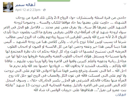 من جانبها، علقت المستشار الأسرية والتربوية “هالة سمير” على مسألة زواج أرامل الشهداء بتدوينة عبر صفحته الرسمية على موقع “فيس بوك” قائلة: “جاءتني من فترة أسئلة واستشارات حول الزواج الثاني ولكن تلك المرة من زوجات الشهداء”.