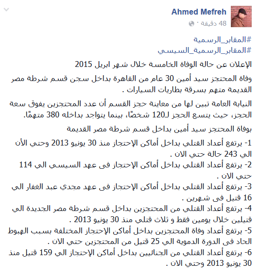 كشف الناشط الحقوقي أحمد مفرح -الباحث بمؤسسة الكرامة لحقوق الإنسان- عن وفاة المحتجز سيد أمين “30 عاما- من القاهرة” داخل سجن قسم شرطة مصر القديمة، على خلفية اتهامه بسرقة بطاريات السيارات، ليكون بذلك الحالة الخامسة خلال شهر إبريل 2015.