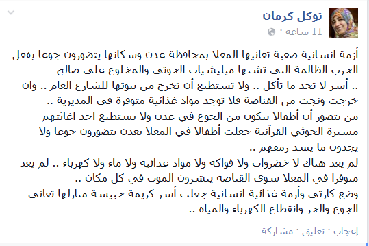 وأضافت- عبر تدوينة لها على موقع التواصل الاجتماعي “فيس بوك”- “أسر لا تجد ما تأكل .. ولا تستطيع أن تخرج من بيوتها للشارع العام .. وإن خرجت ونجت من القناصة فلا توجد مواد غذائية متوفرة في المديرية”.