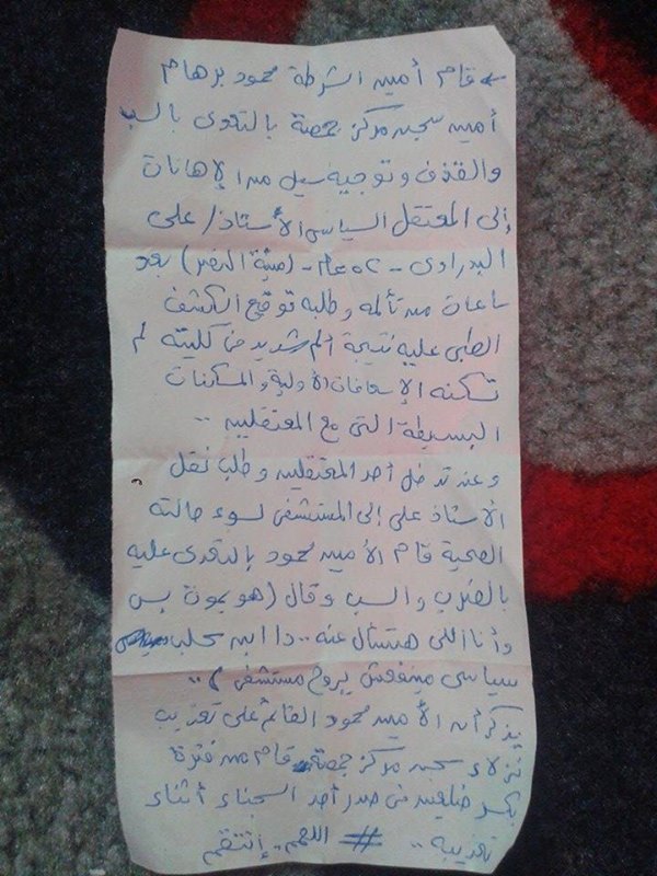 وكشفت الرسالة، باعتداء أمين الشرطة محمود برهام، بالسب والقذف على المعتقل السياسي، على البدراوي “52 عاماً” من منية النصر، المريض بالكلي بعد إصابته بوعكة صحية شديدة ورفض نقله إلى المستشفي للعلاج، قائلاً: “هو يموت بس وأنا اللى هتسأل عنه.. ده ابن كلب سياسي مينفعش يروح مستشفى”.