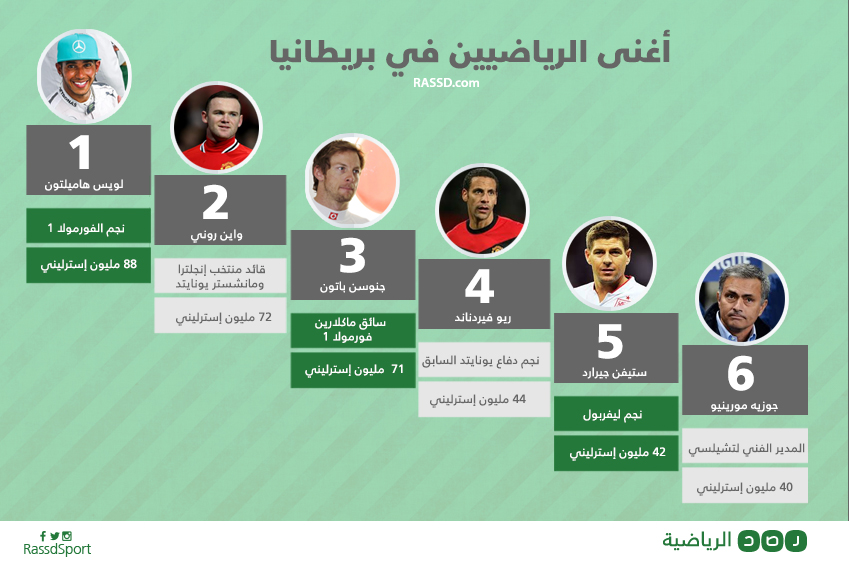 تصدر نجم سباقات السرعة لويس هاميلتون، سائق فريق مرسيدس في بطولة العالم للفورمولا 1، قائمة أغنى الرياضيين في بريطانيا، بينما جاء في المركز الثاني واين روني قائد منتخب إنجلترا ومانشستر يونايتد.